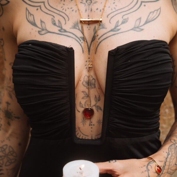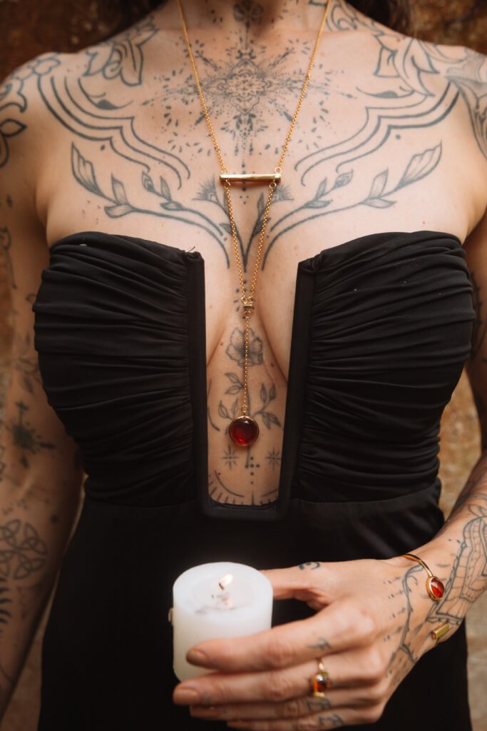 Nessa coleção a gente trouxe como pedra do Manipura o cristal Citrino.